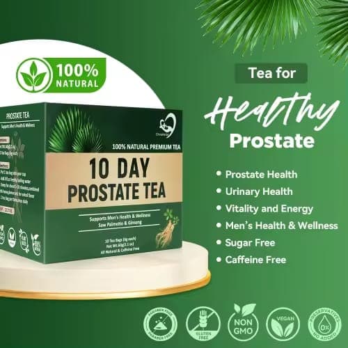A 100% Natural Premium Tea formulated to support Men's Health & Wellness. This specialized blend includes traditional ingredients like Saw Palmetto and Ginseng to promote Prostate Health, support Urinary Health, and boost Vitality and Energy. The formula is Sugar-Free, Caffeine-Free, Vegan, Non-GMO, and designed for a simple 10-day routine.