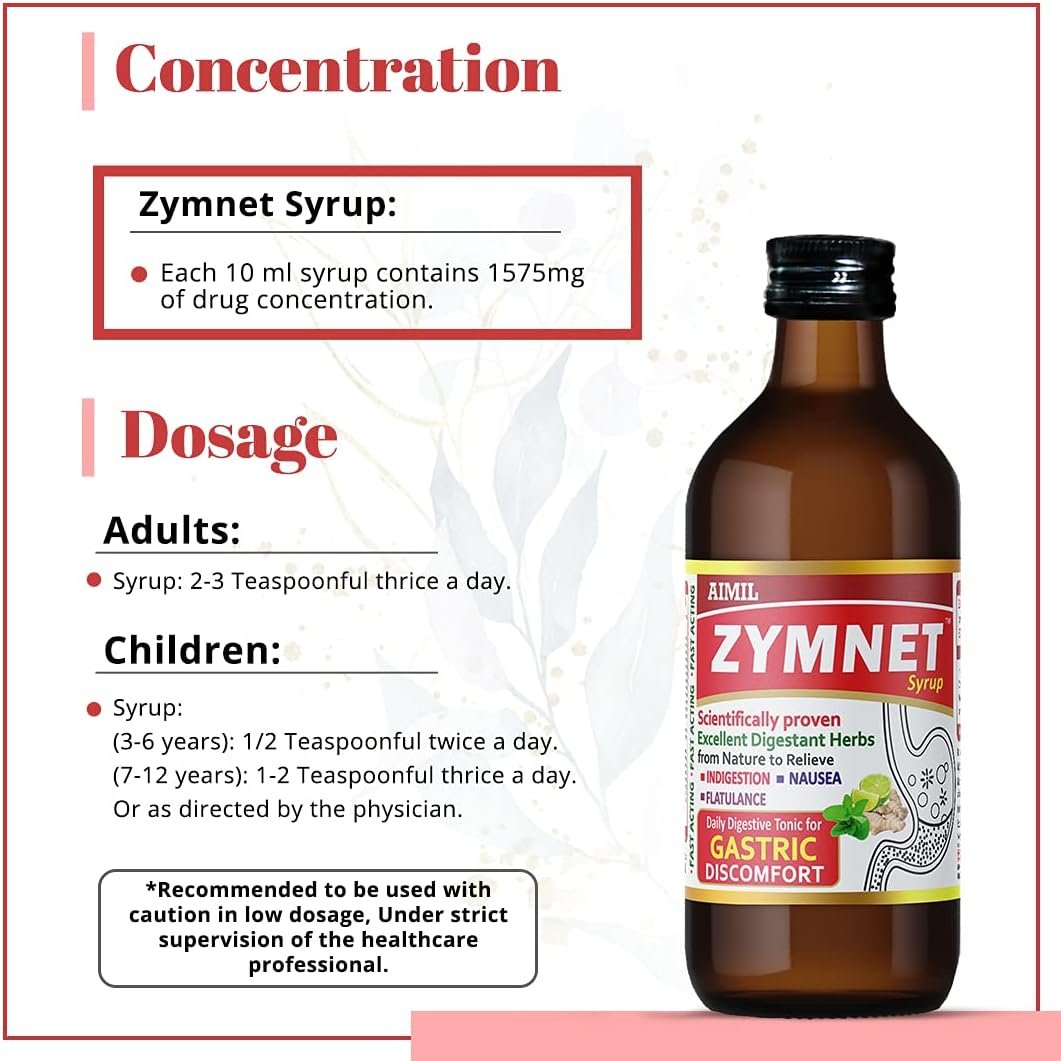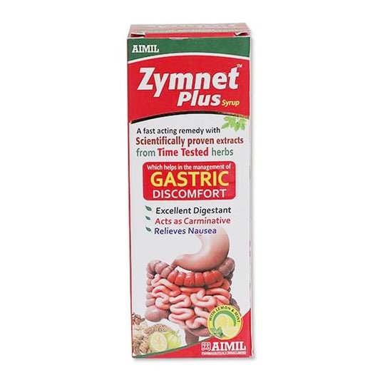 Aimil Zymnet Plus Syrup is a fast-acting, scientifically proven remedy featuring a specialized blend of digestive enzymes and vital plant extracts from time-tested herbs. Designed to aid digestion, this syrup is primarily formulated for children but can be used by adults, and helps in the management of gastric discomfort. It functions as an Excellent Digestant, acts as a Carminative, and actively Relieves Nausea, Indigestion, and Flatulence. The carefully calibrated blend of Amylase, Protease, and Lipase digestive enzymes helps break down complex carbohydrates, proteins, and fats for smoother digestion. Herbal extracts like Ginger Extract and/or Fennel Extract naturally soothe the digestive tract and reduce bloating. This gentle, child-friendly formula supports overall gut health and enhances optimal absorption of essential nutrients. For children, the recommended dosage is to administer 5 ml of syrup after meals, 2–3 times a day. Adult dosage is 2-3 Teaspoonful thrice a day. The concentration is high, with 10 ml syrup containing 1575mg of drug concentration. The product should be stored in a cool, dry place and should not be refrigerated unless otherwise directed.