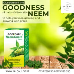 Goodcare Neem Guard Capsules are a powerful, natural Ayurvedic formulation combining three of nature's favorite herbs: Pure Neem, Giloy, and Triphala extracts. This synergistic blend provides exceptional all-over health benefits, helping you keep fit and active from the inside out. The primary benefits include achieving Clear & Healthy Skin by combating skin problems like acne, pimples, rashes, and reducing itchiness due to its antibacterial and anti-inflammatory qualities. Neem is a popular Natural Blood Purifier that effectively cleanses your system and helps flush out toxins. The Giloy and Triphala extracts act as a Powerful Immunity Booster, strengthening the body's defense mechanism against common bacteria and viruses. Furthermore, the Triphala component (Amla, Baheda, and Haritaki) acts as a herbal laxative that provides quick Digestive Relief from issues like constipation, acidity, flatulence, and bloating. The capsules also support an Active Respiratory System due to Giloy’s antipyretic, antitussive, and expectorant properties. Neem is also known as "mwarubaini" in Kiswahili, suggesting its wide variety of healing properties. The recommended dosage is 2 capsules every morning with water on an empty Stomach or as directed by your physician.