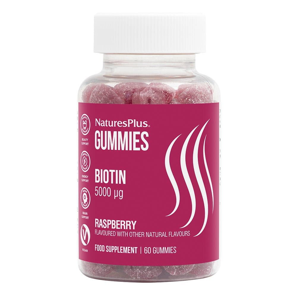 Nature’s Plus Biotin Gummies deliver a potent 5000 mcg dose of Biotin, a vital B vitamin, in a delicious raspberry-flavored gummy. Designed for Beauty Support, Energy Support, and Brain Support, these vegan food supplements are crafted to support the health of hair, skin, and nails, promoting strong, healthy hair and radiant skin. Biotin helps convert food into energy, supporting metabolism and aiding in fat and protein metabolism for better nutrient utilization. Each serving contains 5000 mcg of Biotin, representing 16,667% of the daily value. Other ingredients include glucose syrup, sugar, water, and pectin. The gummies are free from synthetic colors, flavors, milk, egg, gluten, soy, and GMOs. Chew one gummy daily, preferably with a meal, and do not exceed the recommended dosage. The bottle contains 60 Gummies.